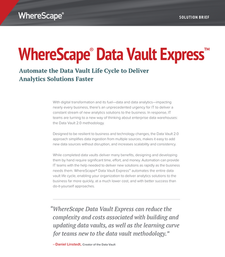 WhereScape automates the design and build of data warehouses, marts, lakes and Data Vaults: so that you can iterate in clicks, not months. In this video explainer, we use a house-building analogy to d ...